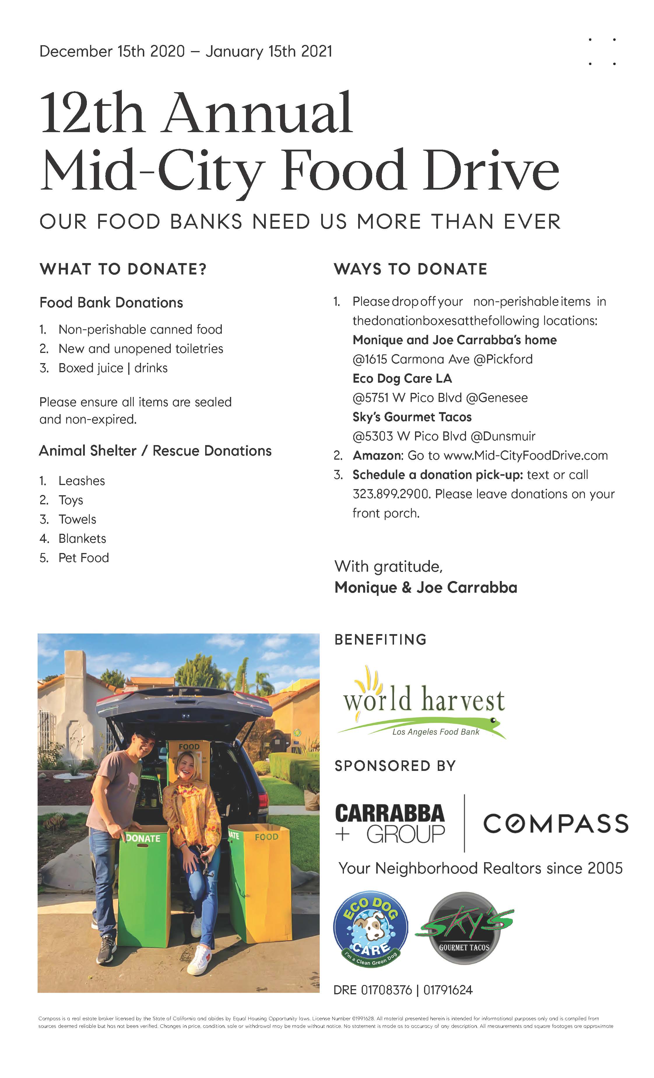 Our Food Banks need us more than ever! For our 12th annual Mid-City Food Drive, we are partnering with a fantastic organization World Harvest Food Bank is a non-profit organization, established in 2007, that provides food, basic staples and living essentials to people who are at risk of hunger and to the needy.