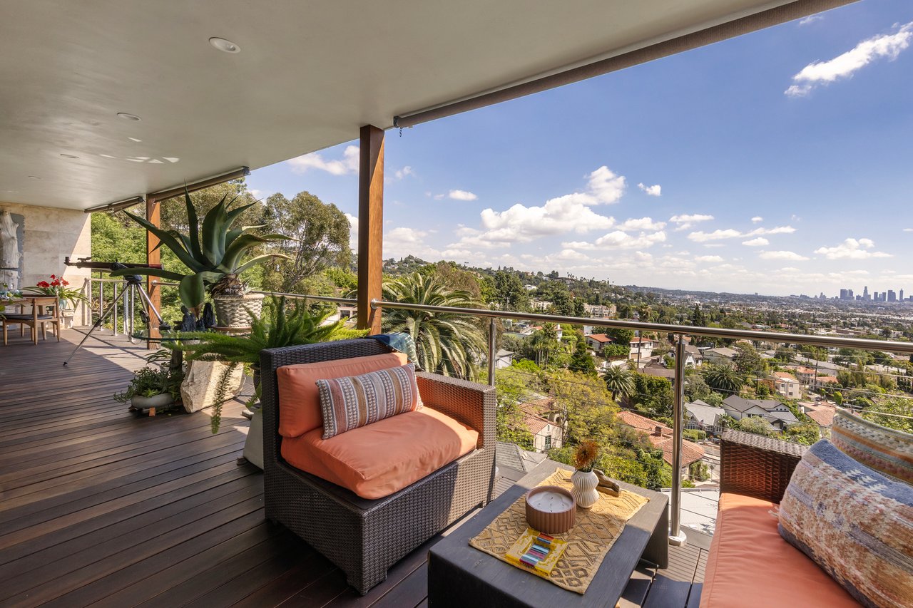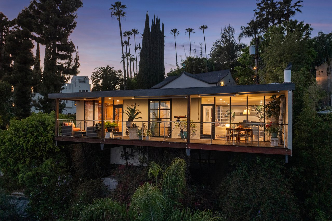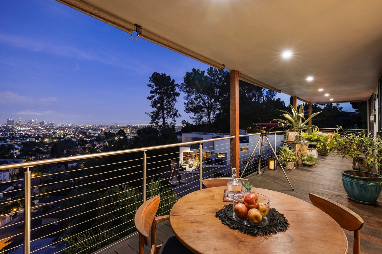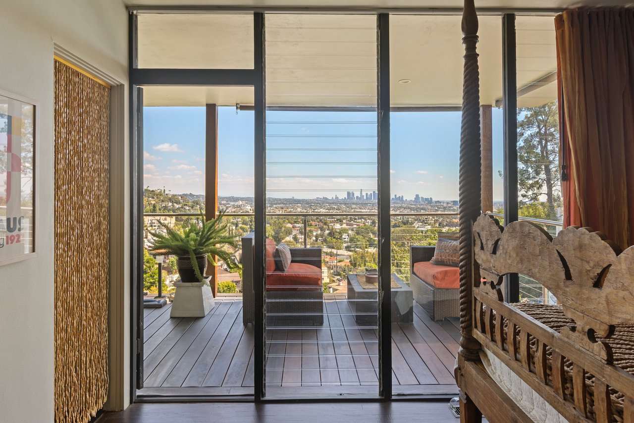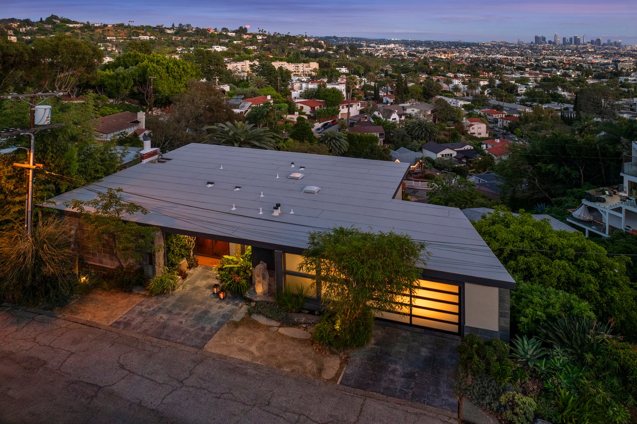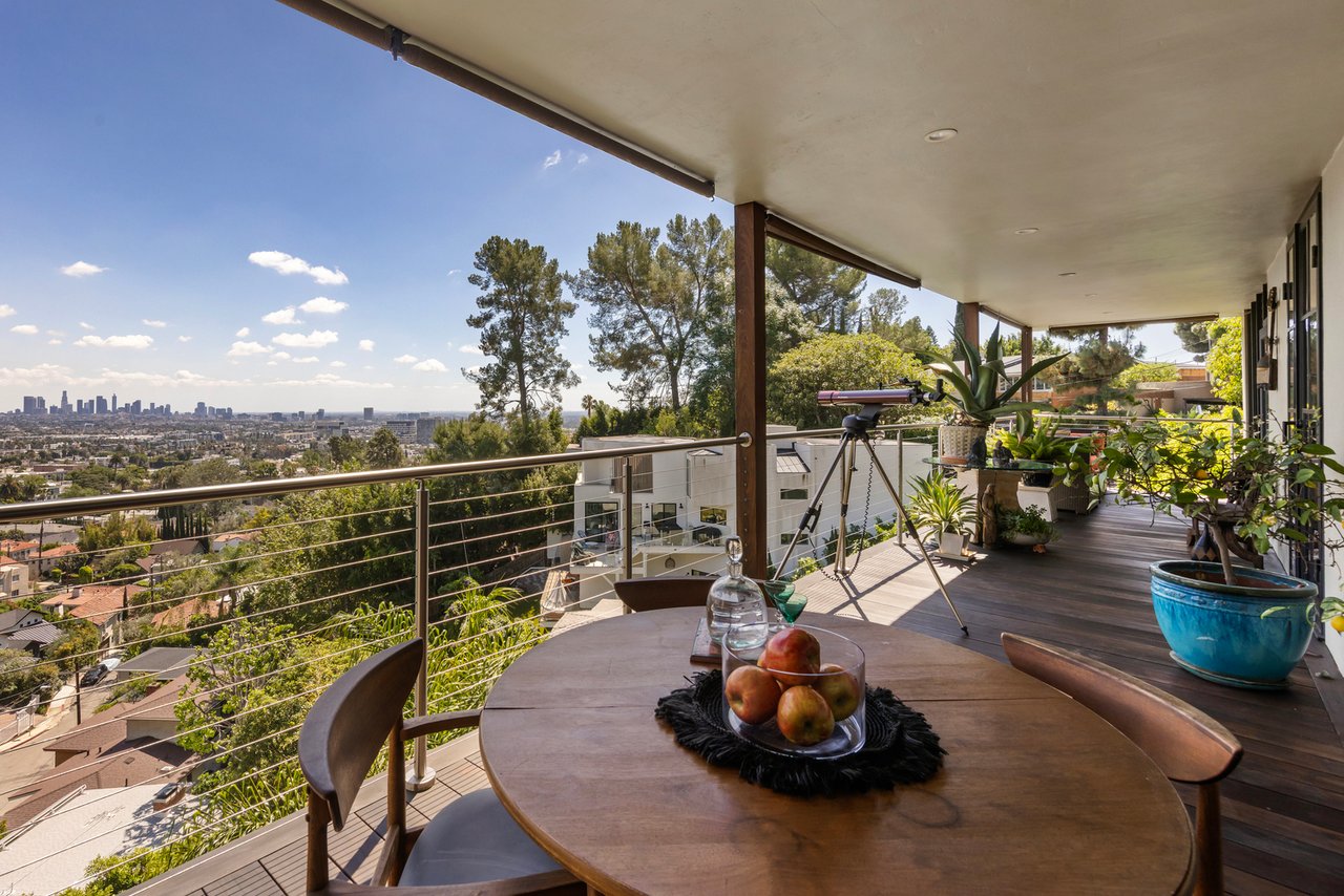 Welcome to this 1959 Mid-Century home by Joseph Railla, AIA, known as Residence Yoshikawa. Thoughtfully updated with a refined, Zen-inspired sensibility, the home blends its original architectural integrity with a calm, material-driven design approach. Set high above Beachwood Canyon, this 2-bedroom, 2-bathroom + office home captures sweeping views of the Downtown Los Angeles skyline, the Hollywood Sign, and Griffith Observatory. Expansive walls of glass invite natural light throughout while framing the surrounding canyon landscape. Step through the entry, where the gentle sound of water introduces the home's tranquil atmosphere, and continue through double doors into the interior. An office off the foyer provides a flexible work-from-home space. The open living and dining areas, anchored by a period barrel fireplace, flow seamlessly to a covered Ipe wood deck accessible from the living room, kitchen, and primary bedroom creating effortless indoor-outdoor living with an eastern orientation for morning light. The kitchen offers custom finishes and direct access to the deck, ideal for outdoor dining, relaxing, and entertaining. The primary suite features an en-suite bath and a wall of glass with expansive views, while the secondary bedroom complete with its own bath functions equally well as a guest suite, office, or creative studio. A curated palette of stone, glass, and wood adds warmth and continuity throughout. Select design enhancements include hand-set stonework and custom surfaces that emphasize texture, balance, and connection to the natural setting. Below, a garden area with citrus trees offers a peaceful outdoor retreat. Additional features include hardwood floors, central HVAC, and an attached one-car garage with direct access from the second bedroom. A rare opportunity to own a timeless architectural home that pairs Mid-Century design with a serene, modern sensibility.