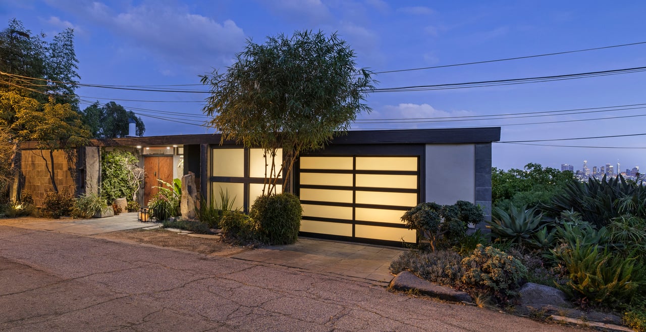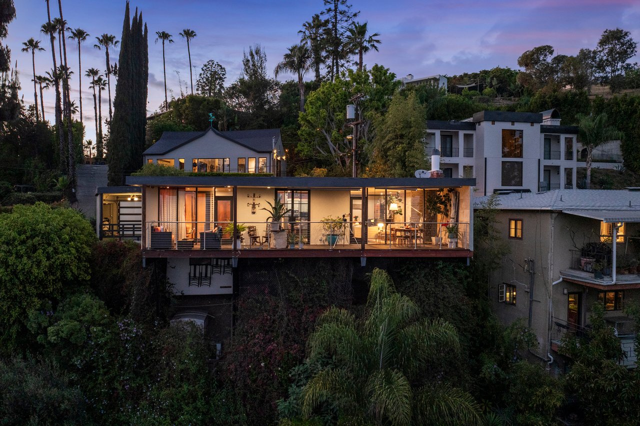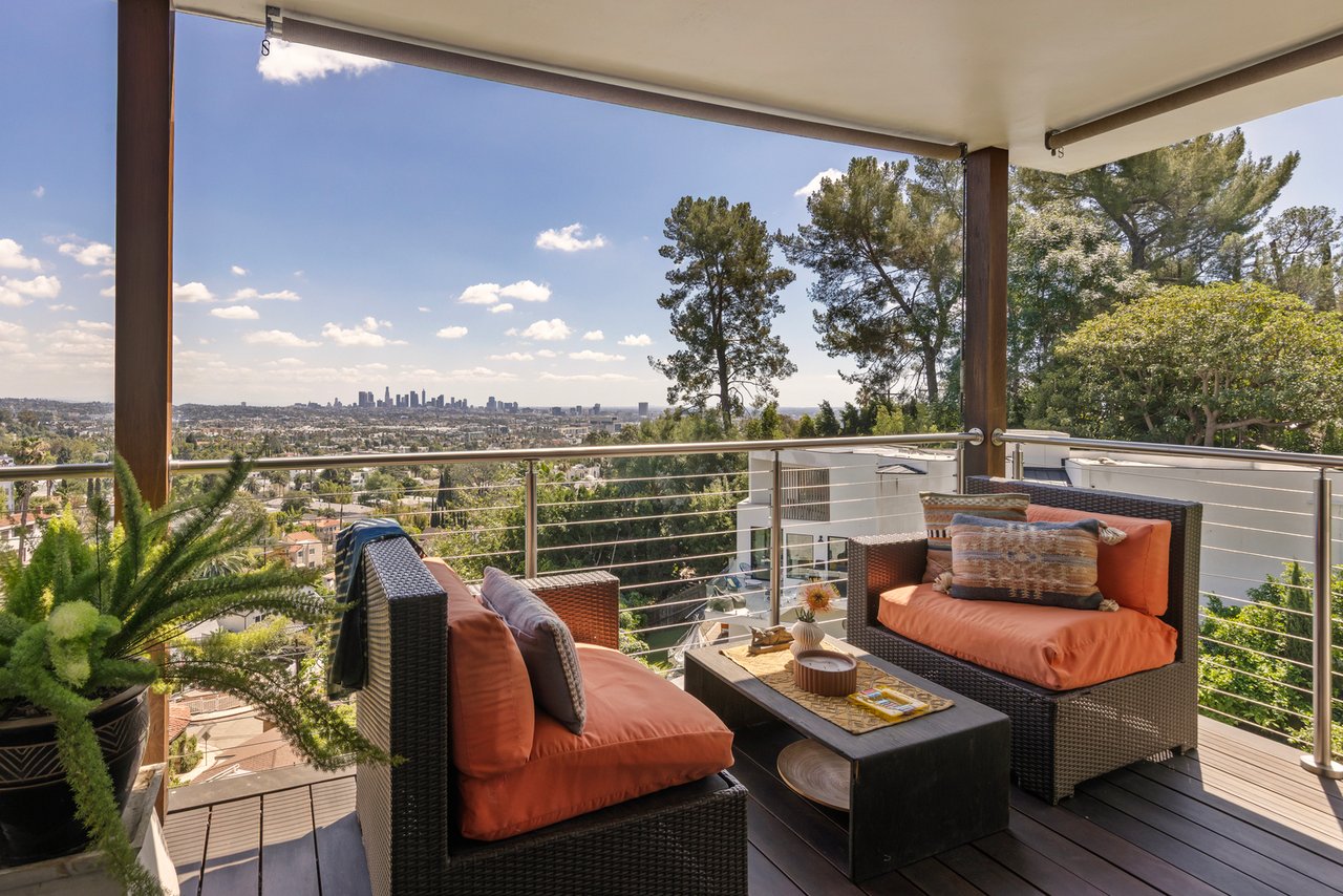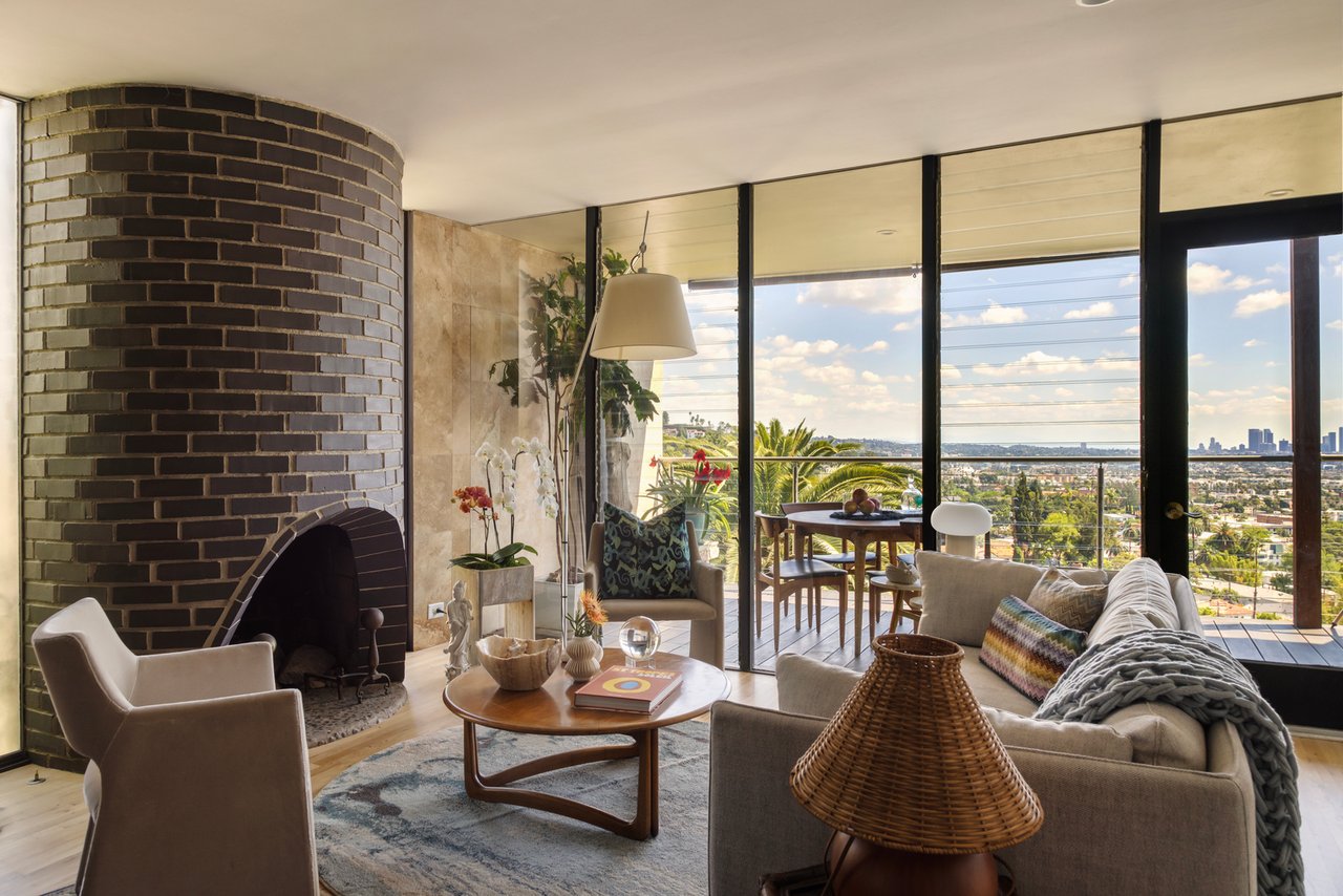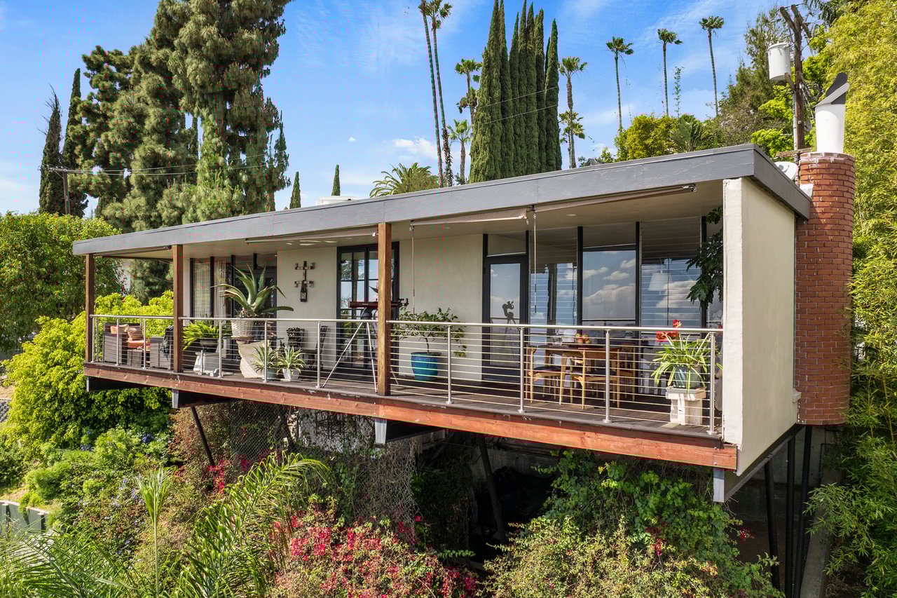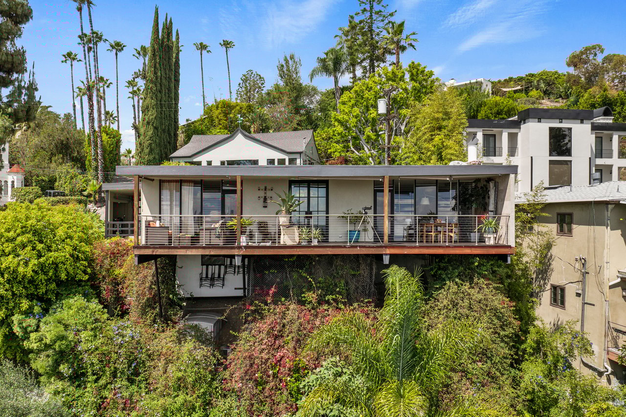 Welcome to this 1959 Mid-Century home by Joseph Railla, AIA, known as Residence Yoshikawa. Thoughtfully updated with a refined, Zen-inspired sensibility, the home blends its original architectural integrity with a calm, material-driven design approach. Set high above Beachwood Canyon, this 2-bedroom, 2-bathroom + office home captures sweeping views of the Downtown Los Angeles skyline, the Hollywood Sign, and Griffith Observatory. Expansive walls of glass invite natural light throughout while framing the surrounding canyon landscape. Step through the entry, where the gentle sound of water introduces the home's tranquil atmosphere, and continue through double doors into the interior. An office off the foyer provides a flexible work-from-home space. The open living and dining areas, anchored by a period barrel fireplace, flow seamlessly to a covered Ipe wood deck accessible from the living room, kitchen, and primary bedroom creating effortless indoor-outdoor living with an eastern orientation for morning light. The kitchen offers custom finishes and direct access to the deck, ideal for outdoor dining, relaxing, and entertaining. The primary suite features an en-suite bath and a wall of glass with expansive views, while the secondary bedroom complete with its own bath functions equally well as a guest suite, office, or creative studio. A curated palette of stone, glass, and wood adds warmth and continuity throughout. Select design enhancements include hand-set stonework and custom surfaces that emphasize texture, balance, and connection to the natural setting. Below, a garden area with citrus trees offers a peaceful outdoor retreat. Additional features include hardwood floors, central HVAC, and an attached one-car garage with direct access from the second bedroom. A rare opportunity to own a timeless architectural home that pairs Mid-Century design with a serene, modern sensibility.