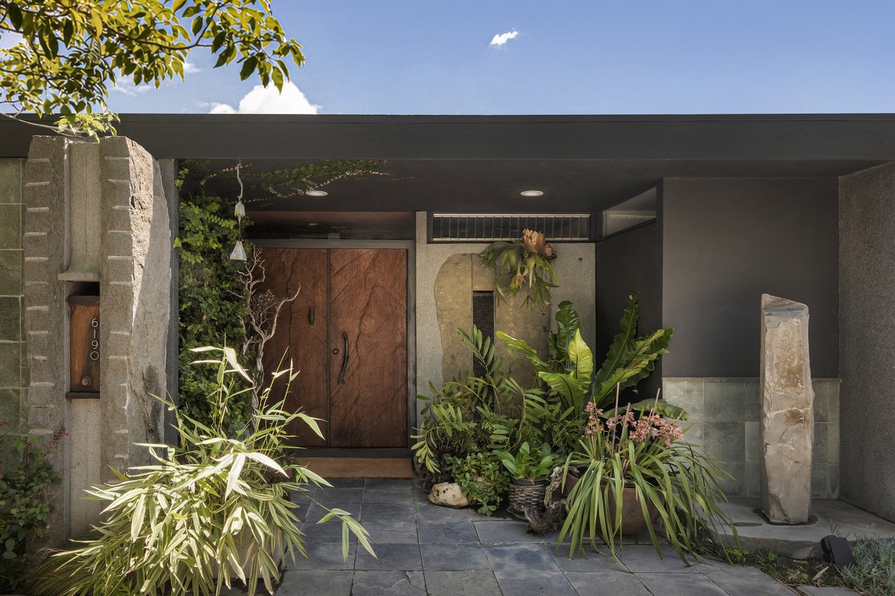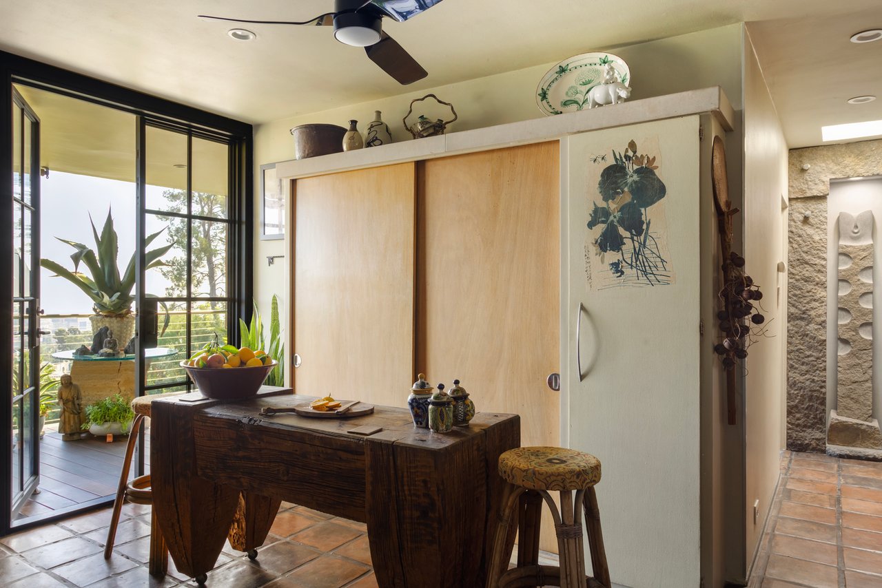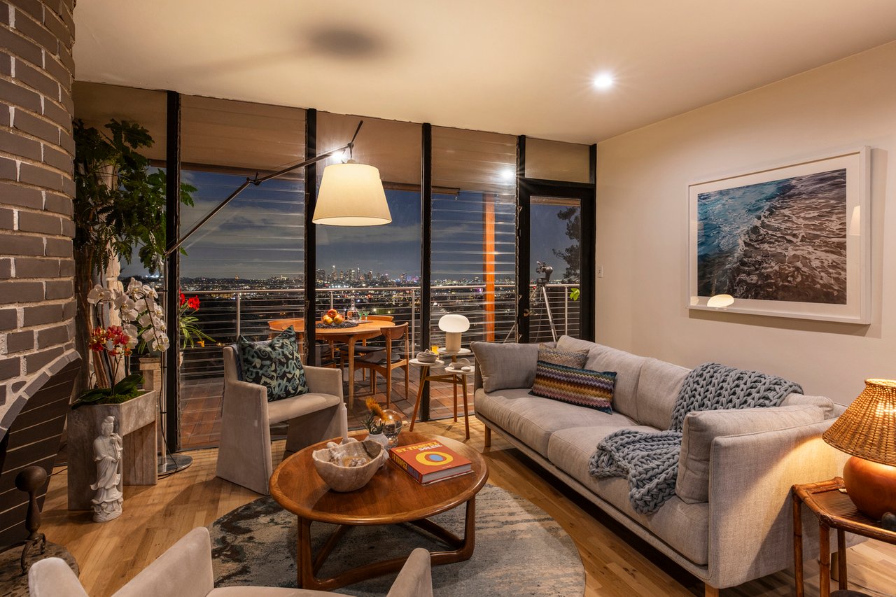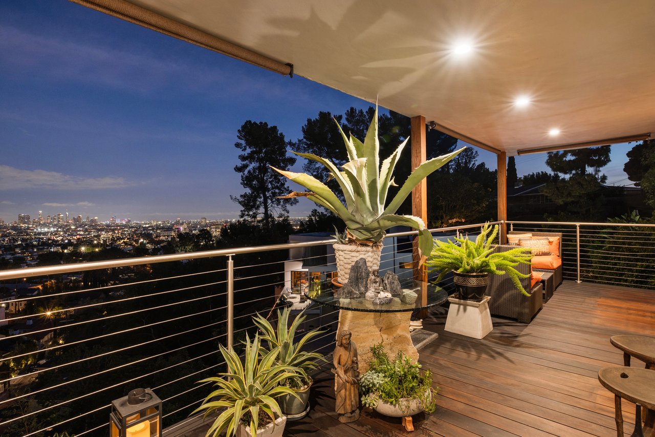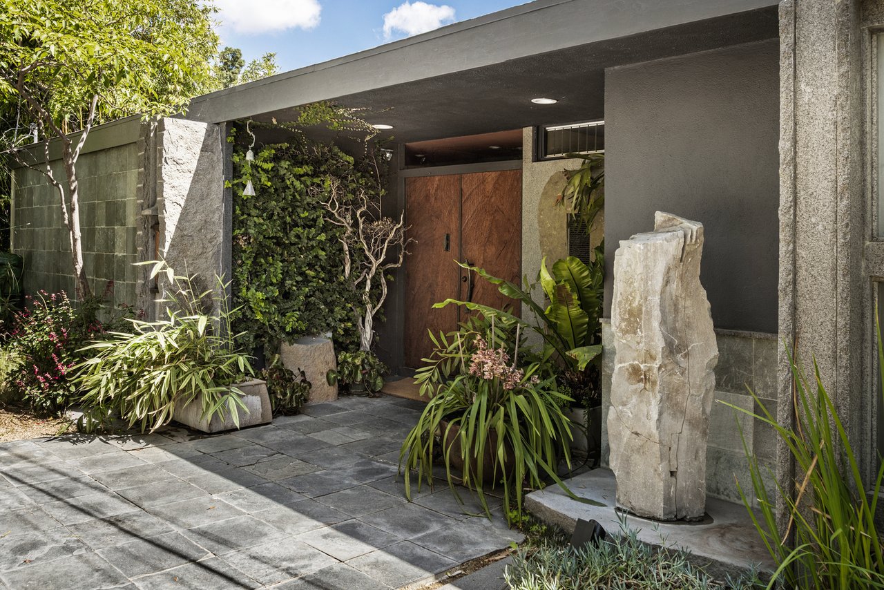 Welcome to this 1959 Mid-Century home by Joseph Railla, AIA, known as Residence Yoshikawa. Thoughtfully updated with a refined, Zen-inspired sensibility, the home blends its original architectural integrity with a calm, material-driven design approach. Set high above Beachwood Canyon, this 2-bedroom, 2-bathroom + office home captures sweeping views of the Downtown Los Angeles skyline, the Hollywood Sign, and Griffith Observatory. Expansive walls of glass invite natural light throughout while framing the surrounding canyon landscape. Step through the entry, where the gentle sound of water introduces the home's tranquil atmosphere, and continue through double doors into the interior. An office off the foyer provides a flexible work-from-home space. The open living and dining areas, anchored by a period barrel fireplace, flow seamlessly to a covered Ipe wood deck accessible from the living room, kitchen, and primary bedroom creating effortless indoor-outdoor living with an eastern orientation for morning light. The kitchen offers custom finishes and direct access to the deck, ideal for outdoor dining, relaxing, and entertaining. The primary suite features an en-suite bath and a wall of glass with expansive views, while the secondary bedroom complete with its own bath functions equally well as a guest suite, office, or creative studio. A curated palette of stone, glass, and wood adds warmth and continuity throughout. Select design enhancements include hand-set stonework and custom surfaces that emphasize texture, balance, and connection to the natural setting. Below, a garden area with citrus trees offers a peaceful outdoor retreat. Additional features include hardwood floors, central HVAC, and an attached one-car garage with direct access from the second bedroom. A rare opportunity to own a timeless architectural home that pairs Mid-Century design with a serene, modern sensibility.