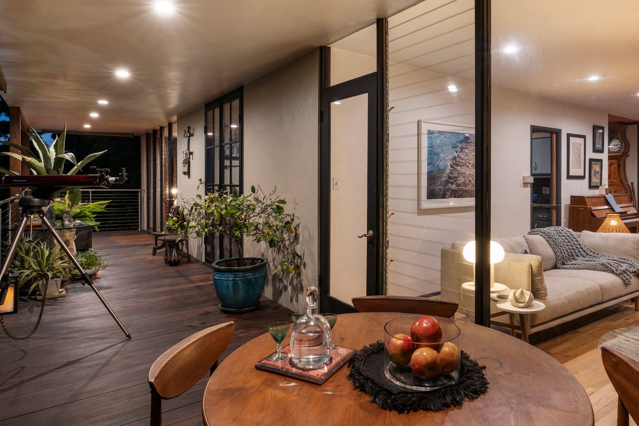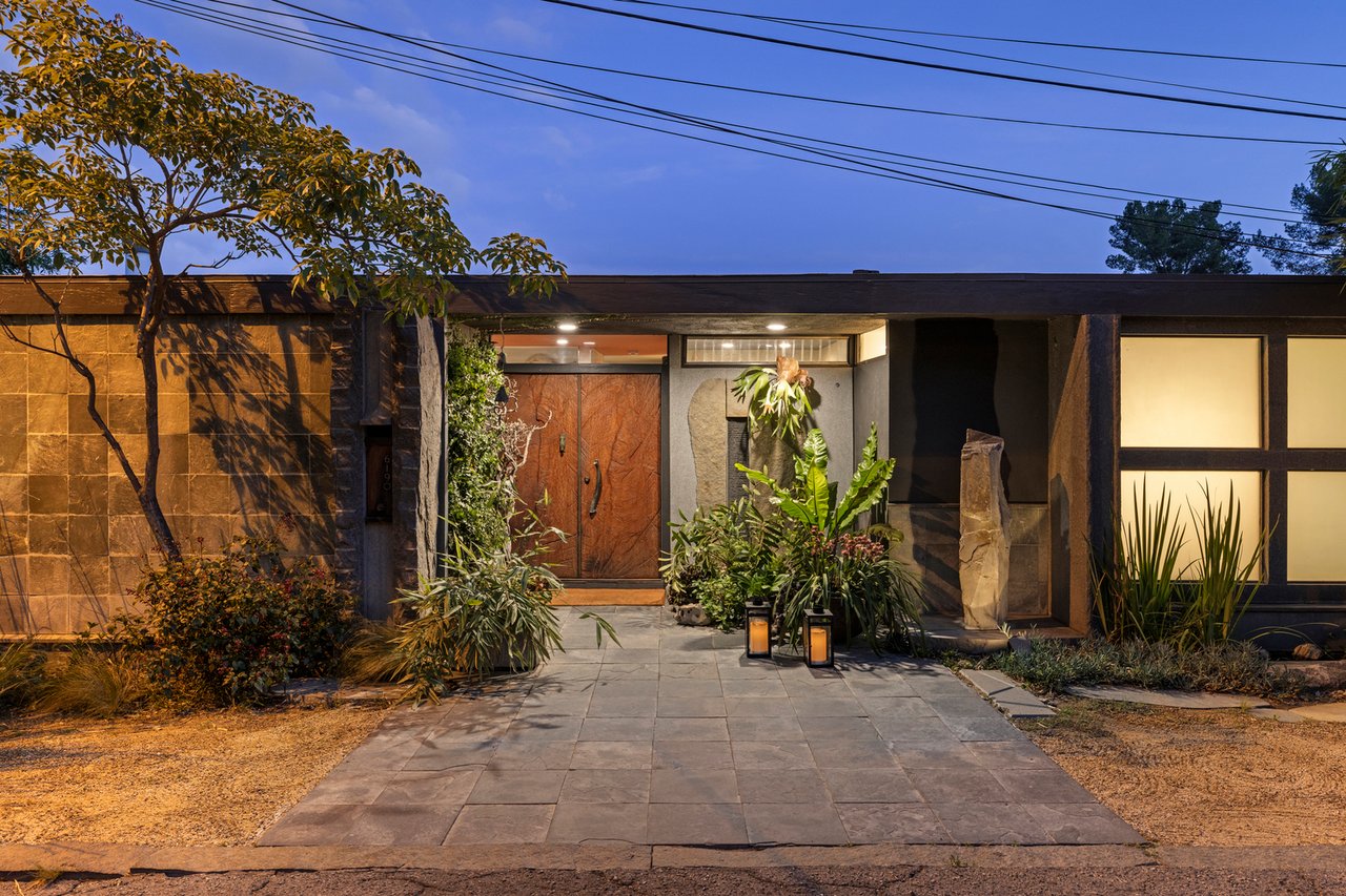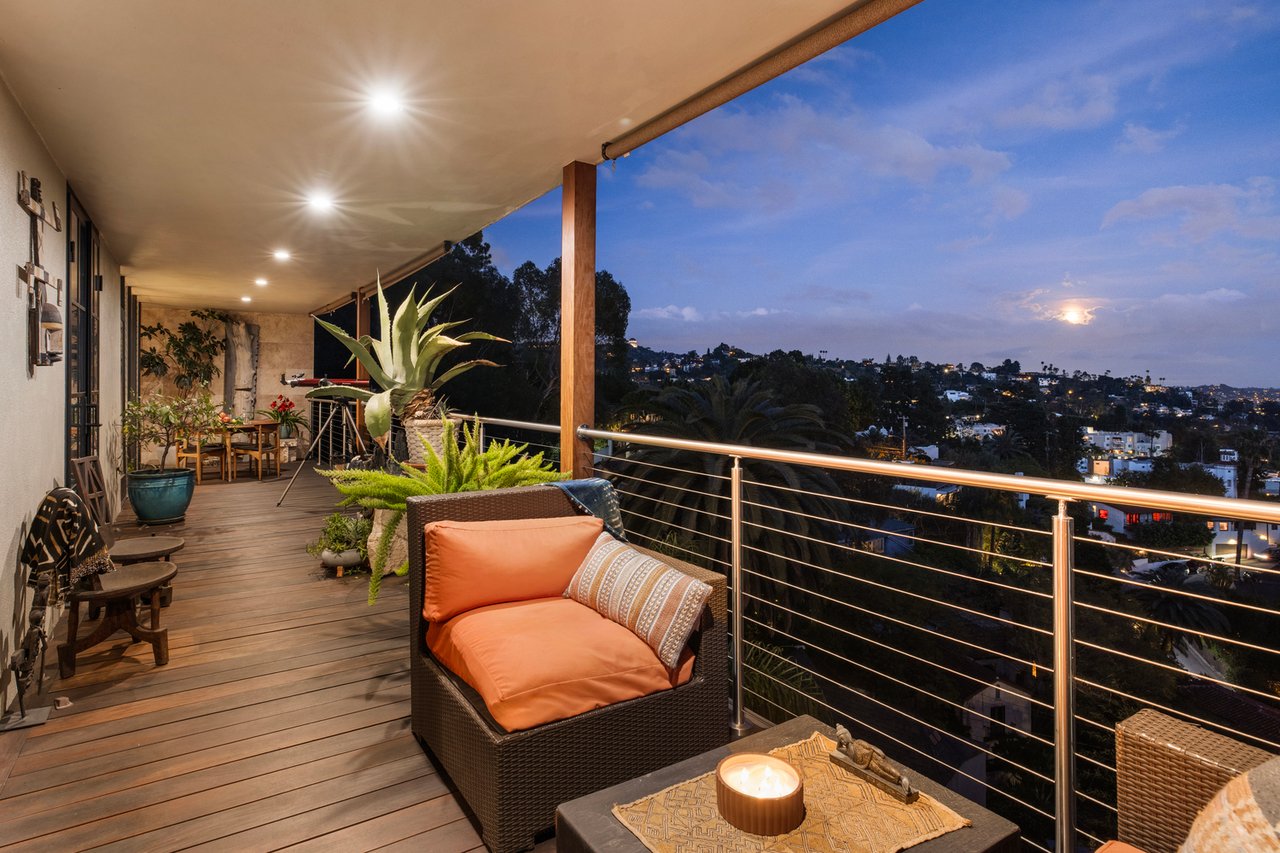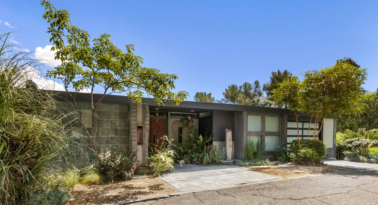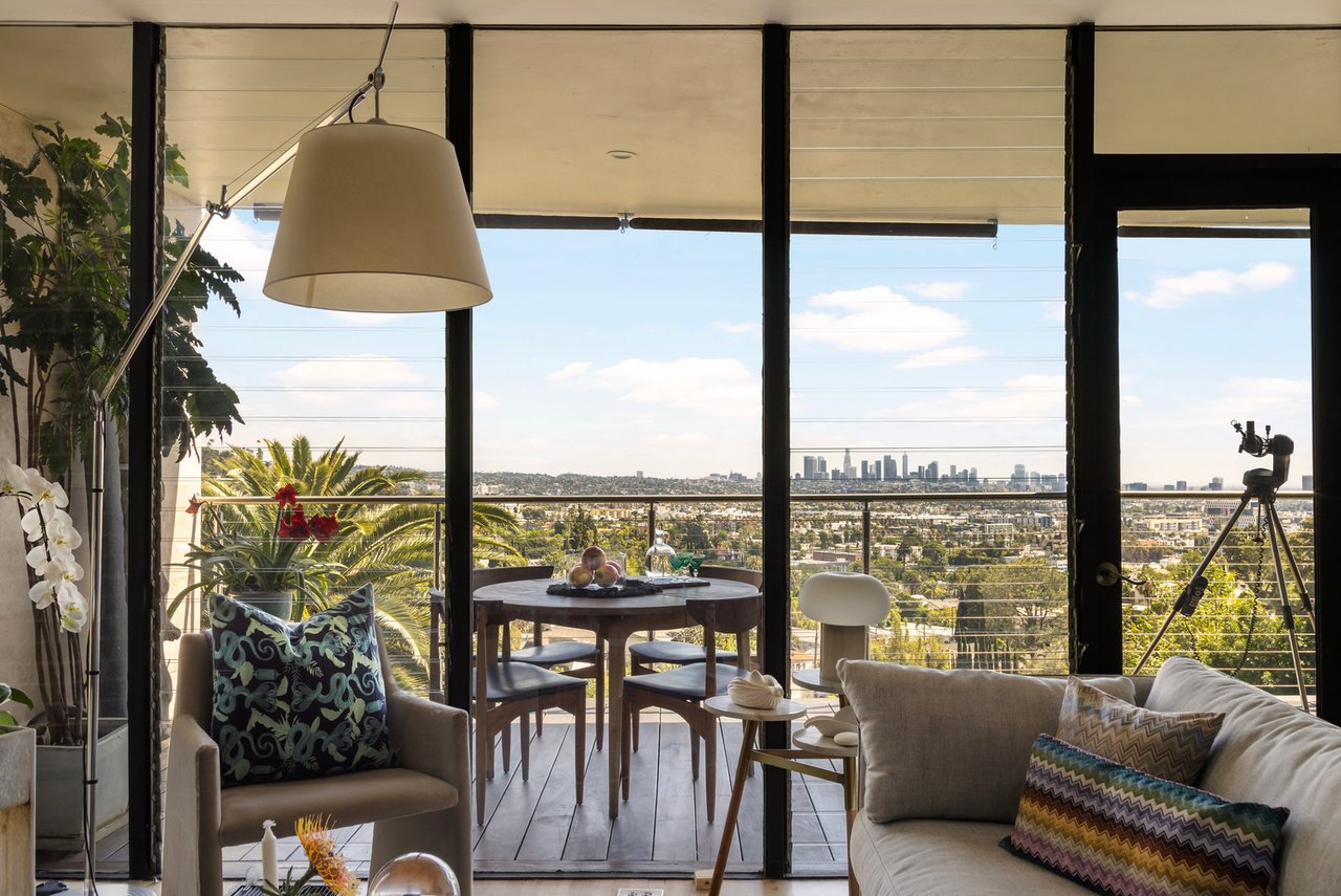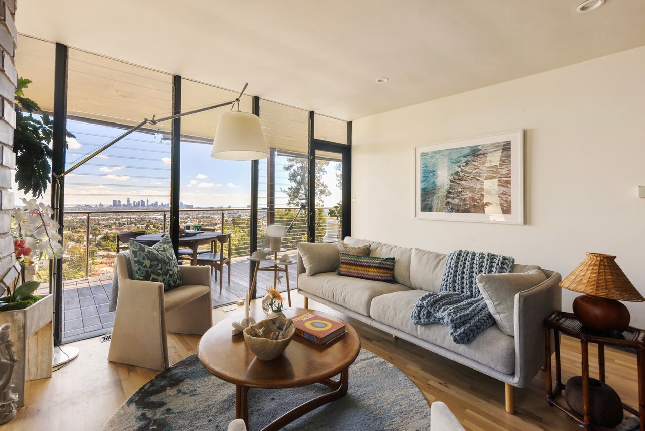 Welcome to this 1959 Mid-Century home by Joseph Railla, AIA, known as Residence Yoshikawa. Thoughtfully updated with a refined, Zen-inspired sensibility, the home blends its original architectural integrity with a calm, material-driven design approach. Set high above Beachwood Canyon, this 2-bedroom, 2-bathroom + office home captures sweeping views of the Downtown Los Angeles skyline, the Hollywood Sign, and Griffith Observatory. Expansive walls of glass invite natural light throughout while framing the surrounding canyon landscape. Step through the entry, where the gentle sound of water introduces the home's tranquil atmosphere, and continue through double doors into the interior. An office off the foyer provides a flexible work-from-home space. The open living and dining areas, anchored by a period barrel fireplace, flow seamlessly to a covered Ipe wood deck accessible from the living room, kitchen, and primary bedroom creating effortless indoor-outdoor living with an eastern orientation for morning light. The kitchen offers custom finishes and direct access to the deck, ideal for outdoor dining, relaxing, and entertaining. The primary suite features an en-suite bath and a wall of glass with expansive views, while the secondary bedroom complete with its own bath functions equally well as a guest suite, office, or creative studio. A curated palette of stone, glass, and wood adds warmth and continuity throughout. Select design enhancements include hand-set stonework and custom surfaces that emphasize texture, balance, and connection to the natural setting. Below, a garden area with citrus trees offers a peaceful outdoor retreat. Additional features include hardwood floors, central HVAC, and an attached one-car garage with direct access from the second bedroom. A rare opportunity to own a timeless architectural home that pairs Mid-Century design with a serene, modern sensibility.