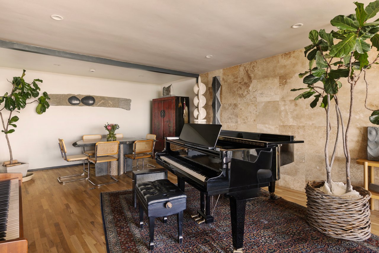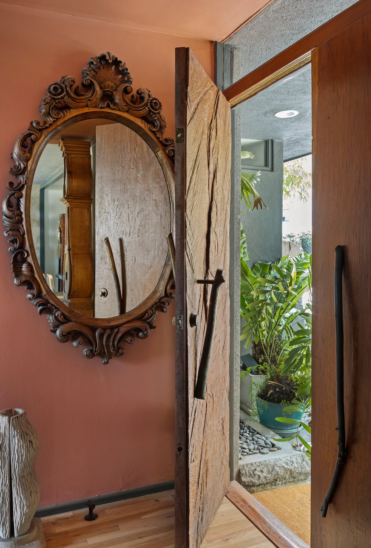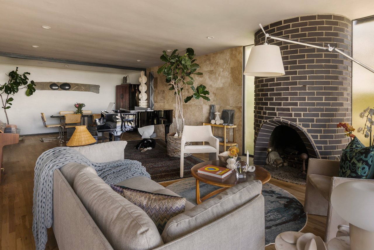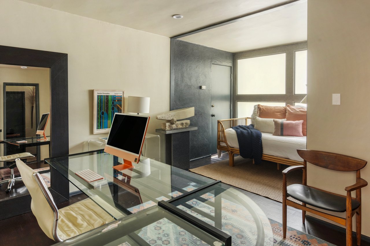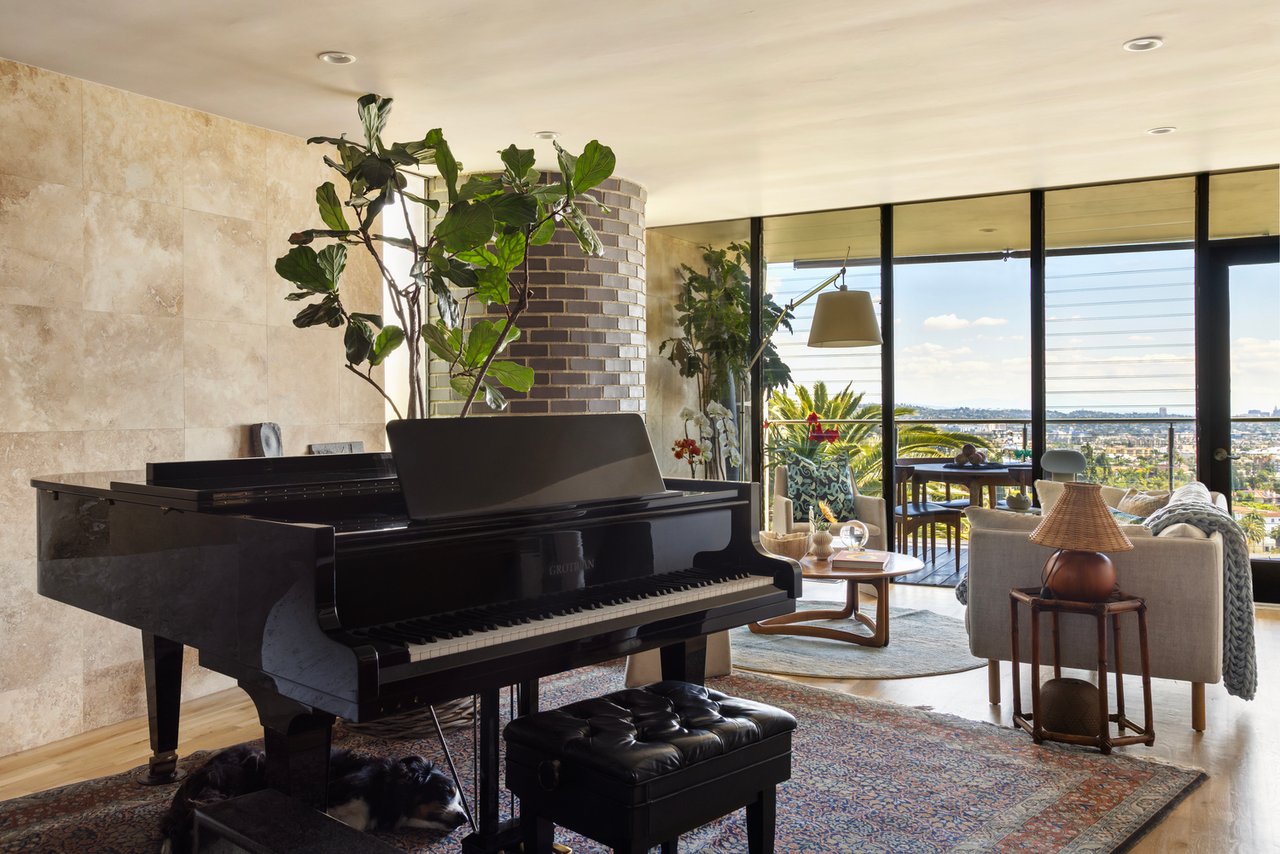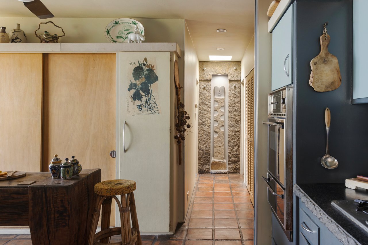 Welcome to this 1959 Mid-Century home by Joseph Railla, AIA, known as Residence Yoshikawa. Thoughtfully updated with a refined, Zen-inspired sensibility, the home blends its original architectural integrity with a calm, material-driven design approach. Set high above Beachwood Canyon, this 2-bedroom, 2-bathroom + office home captures sweeping views of the Downtown Los Angeles skyline, the Hollywood Sign, and Griffith Observatory. Expansive walls of glass invite natural light throughout while framing the surrounding canyon landscape. Step through the entry, where the gentle sound of water introduces the home's tranquil atmosphere, and continue through double doors into the interior. An office off the foyer provides a flexible work-from-home space. The open living and dining areas, anchored by a period barrel fireplace, flow seamlessly to a covered Ipe wood deck accessible from the living room, kitchen, and primary bedroom creating effortless indoor-outdoor living with an eastern orientation for morning light. The kitchen offers custom finishes and direct access to the deck, ideal for outdoor dining, relaxing, and entertaining. The primary suite features an en-suite bath and a wall of glass with expansive views, while the secondary bedroom complete with its own bath functions equally well as a guest suite, office, or creative studio. A curated palette of stone, glass, and wood adds warmth and continuity throughout. Select design enhancements include hand-set stonework and custom surfaces that emphasize texture, balance, and connection to the natural setting. Below, a garden area with citrus trees offers a peaceful outdoor retreat. Additional features include hardwood floors, central HVAC, and an attached one-car garage with direct access from the second bedroom. A rare opportunity to own a timeless architectural home that pairs Mid-Century design with a serene, modern sensibility.