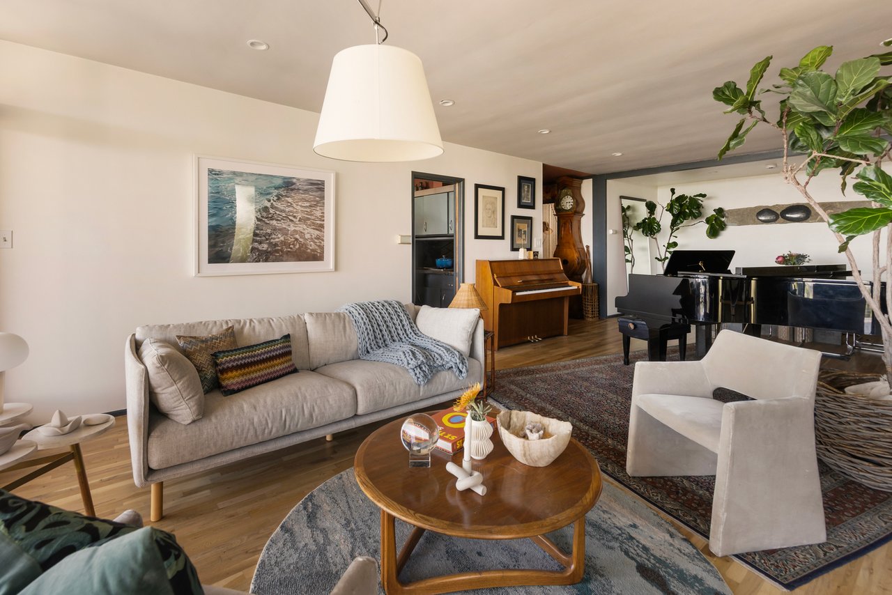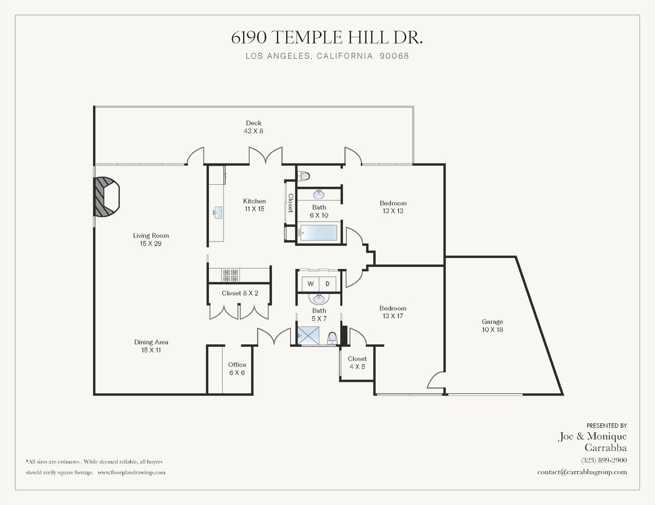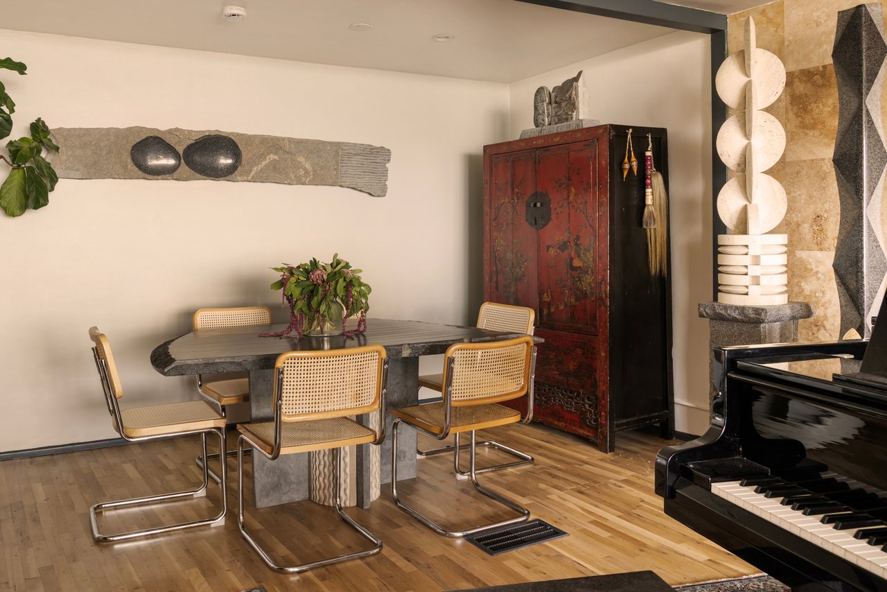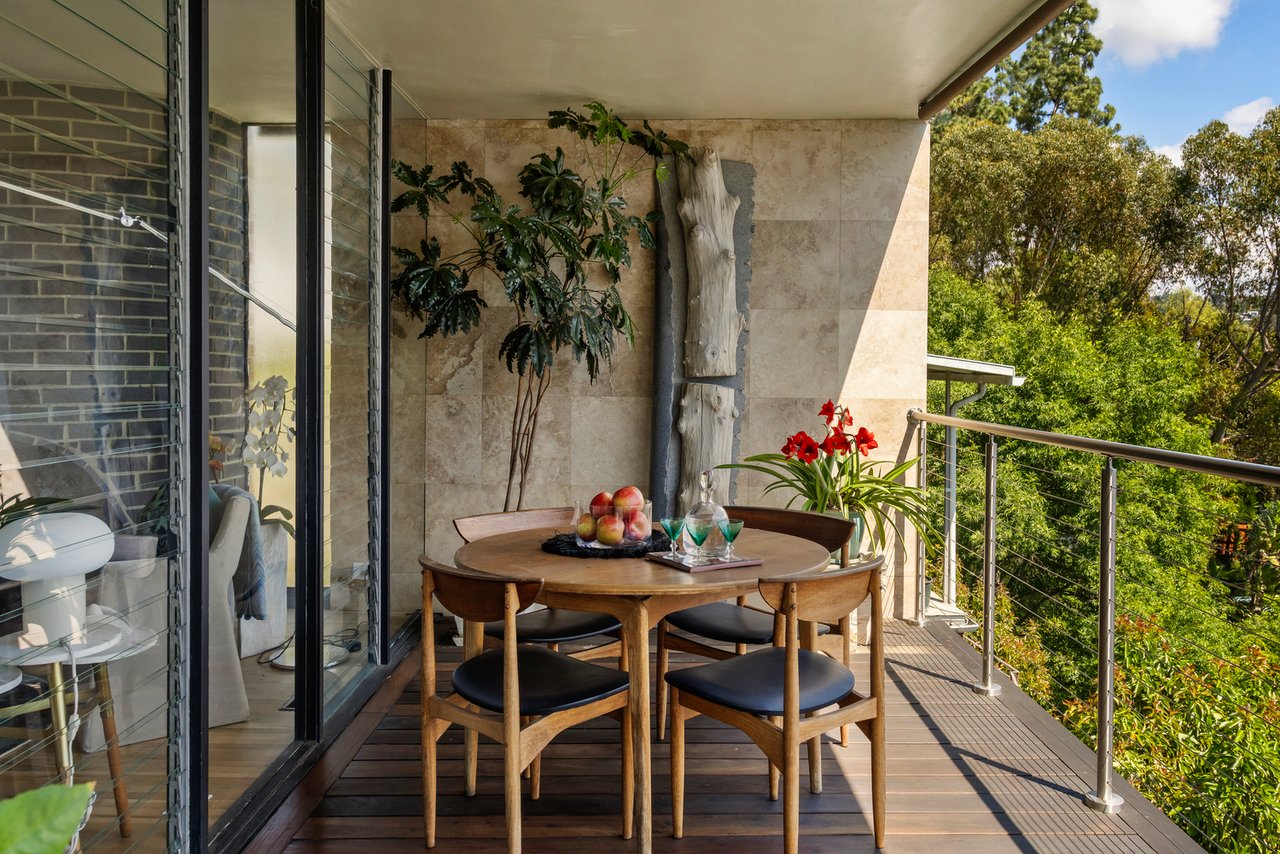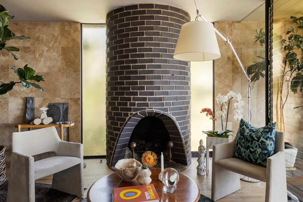 Welcome to this 1959 Mid-Century home by Joseph Railla, AIA, known as Residence Yoshikawa. Thoughtfully updated with a refined, Zen-inspired sensibility, the home blends its original architectural integrity with a calm, material-driven design approach. Set high above Beachwood Canyon, this 2-bedroom, 2-bathroom + office home captures sweeping views of the Downtown Los Angeles skyline, the Hollywood Sign, and Griffith Observatory. Expansive walls of glass invite natural light throughout while framing the surrounding canyon landscape. Step through the entry, where the gentle sound of water introduces the home's tranquil atmosphere, and continue through double doors into the interior. An office off the foyer provides a flexible work-from-home space. The open living and dining areas, anchored by a period barrel fireplace, flow seamlessly to a covered Ipe wood deck accessible from the living room, kitchen, and primary bedroom creating effortless indoor-outdoor living with an eastern orientation for morning light. The kitchen offers custom finishes and direct access to the deck, ideal for outdoor dining, relaxing, and entertaining. The primary suite features an en-suite bath and a wall of glass with expansive views, while the secondary bedroom complete with its own bath functions equally well as a guest suite, office, or creative studio. A curated palette of stone, glass, and wood adds warmth and continuity throughout. Select design enhancements include hand-set stonework and custom surfaces that emphasize texture, balance, and connection to the natural setting. Below, a garden area with citrus trees offers a peaceful outdoor retreat. Additional features include hardwood floors, central HVAC, and an attached one-car garage with direct access from the second bedroom. A rare opportunity to own a timeless architectural home that pairs Mid-Century design with a serene, modern sensibility.