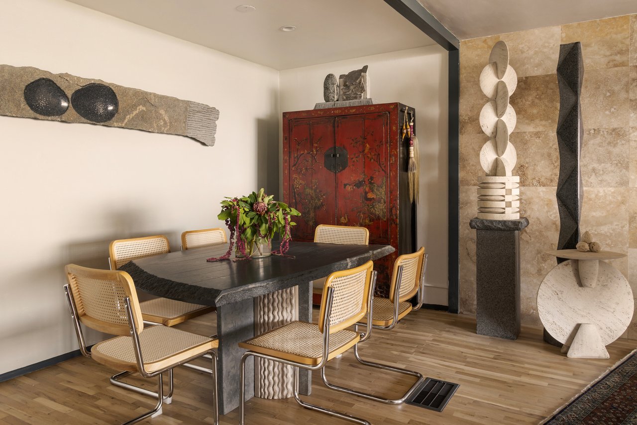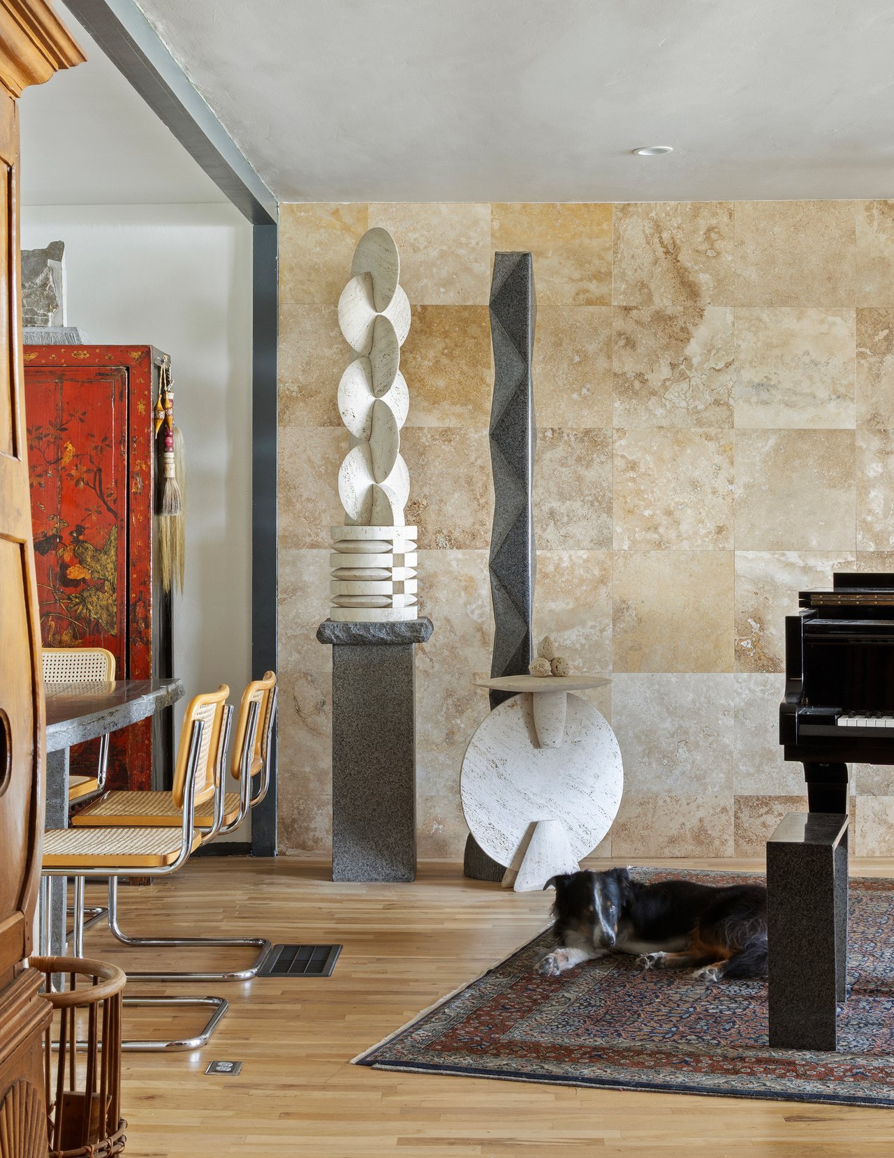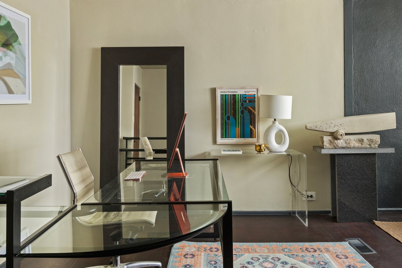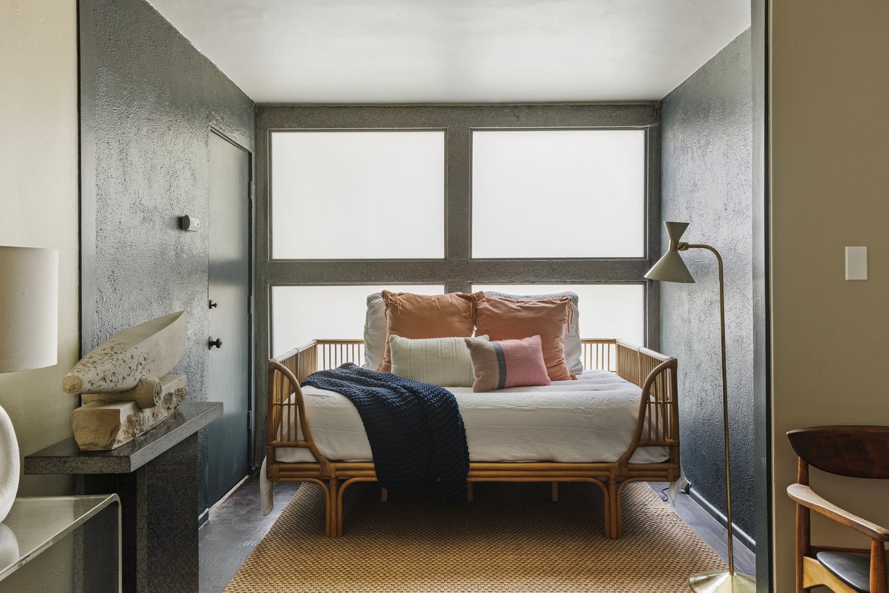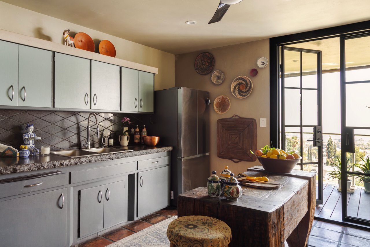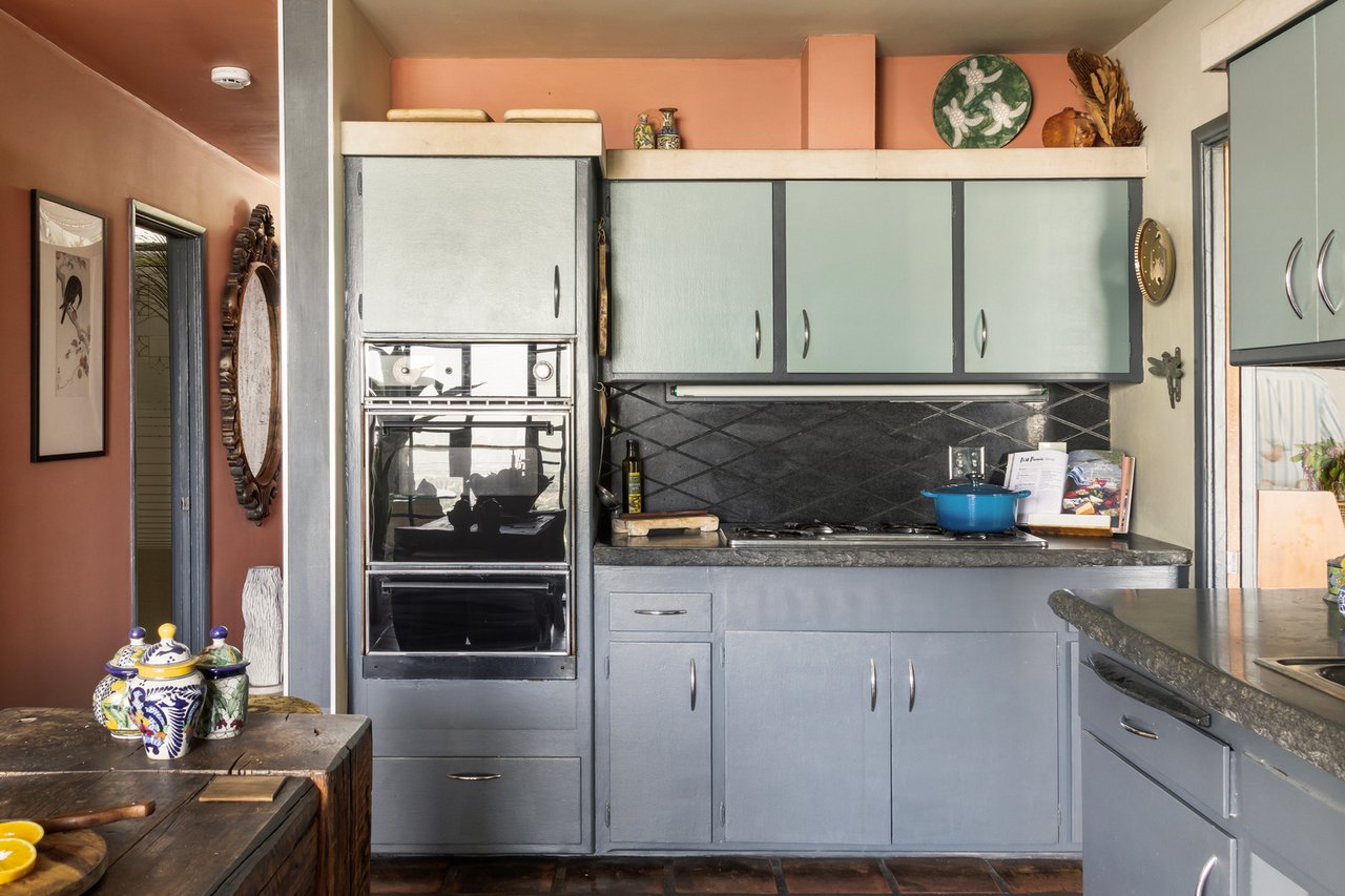 Welcome to this 1959 Mid-Century home by Joseph Railla, AIA, known as Residence Yoshikawa. Thoughtfully updated with a refined, Zen-inspired sensibility, the home blends its original architectural integrity with a calm, material-driven design approach. Set high above Beachwood Canyon, this 2-bedroom, 2-bathroom + office home captures sweeping views of the Downtown Los Angeles skyline, the Hollywood Sign, and Griffith Observatory. Expansive walls of glass invite natural light throughout while framing the surrounding canyon landscape. Step through the entry, where the gentle sound of water introduces the home's tranquil atmosphere, and continue through double doors into the interior. An office off the foyer provides a flexible work-from-home space. The open living and dining areas, anchored by a period barrel fireplace, flow seamlessly to a covered Ipe wood deck accessible from the living room, kitchen, and primary bedroom creating effortless indoor-outdoor living with an eastern orientation for morning light. The kitchen offers custom finishes and direct access to the deck, ideal for outdoor dining, relaxing, and entertaining. The primary suite features an en-suite bath and a wall of glass with expansive views, while the secondary bedroom complete with its own bath functions equally well as a guest suite, office, or creative studio. A curated palette of stone, glass, and wood adds warmth and continuity throughout. Select design enhancements include hand-set stonework and custom surfaces that emphasize texture, balance, and connection to the natural setting. Below, a garden area with citrus trees offers a peaceful outdoor retreat. Additional features include hardwood floors, central HVAC, and an attached one-car garage with direct access from the second bedroom. A rare opportunity to own a timeless architectural home that pairs Mid-Century design with a serene, modern sensibility.